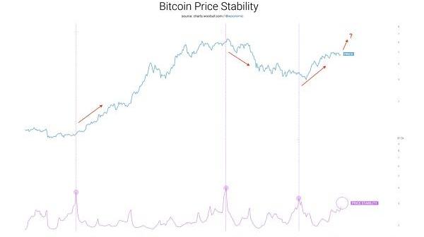 比特币价格稳定性上升到阶段性高位,表明市场波动率下降到低位,市场进入变盘窗口