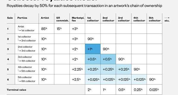 而该件藏品的第二位收藏家,将在作品再度转售时获得0.5%的收藏版税,之后若再次转手也依次递减一半。同理第三位藏家在作品转售时获得0.25%的收藏版税,以此类推。