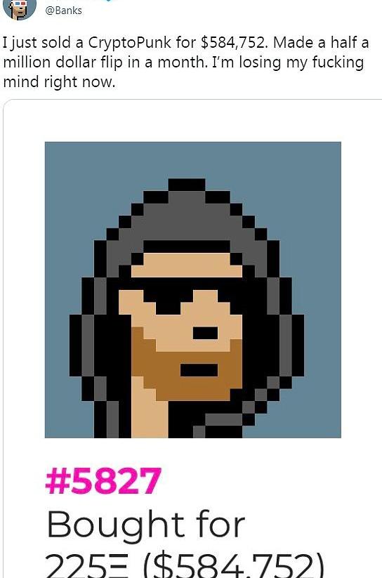 炒作人士也已在这波NFT热潮中获利。一名推特网友日前发文称,自己刚以58万美元的价格出售了一枚CryptoPunk,“相当于一个月赚了50万美元,我简直要疯了”。