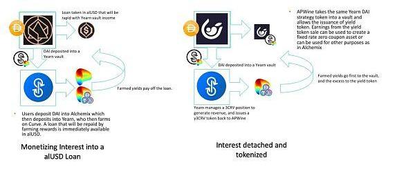 Alchemix是首个了解到这些农场未来的超额产量在当前具有未开发价值的协议。该协议从Yearn的DAI金库中获取收益农场奖励的预期现值,并用它来抵押其alUSD稳定币或alETH的贷款。
