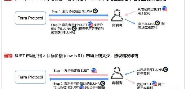 通缩:当稳定币的市场价格>目标价格,系统印新钱&回收股票,套利者可以用股权代币LUNA换新钱