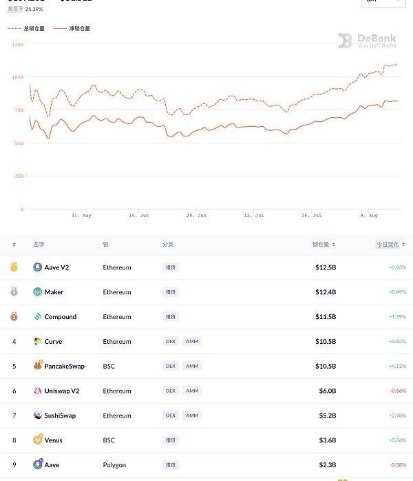 DeFi项目锁定资产前十排名及锁仓量,数据来源:Debank