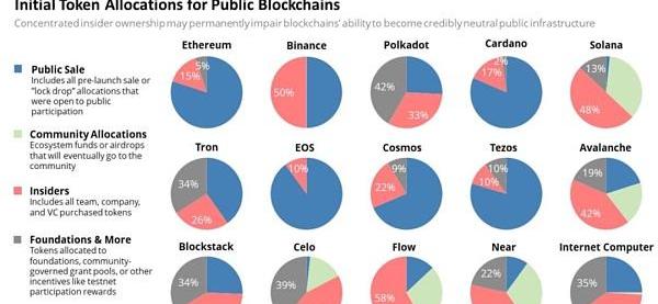 在加密货币的初始供应量中,部分代币直接分给特定内部人员是不平等的一种。请注意,以太坊的数据是稍有问题的:内部人员和基金会的占比应该是12.3%和4.2%,而不是15%和5%。