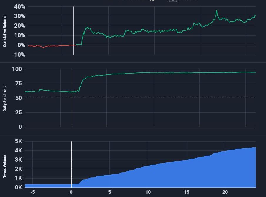 早在2020年,在马斯克发出一条简单的推文“一个词:Doge”之后,DOGE的价格在24小时内飙升了40%。这一疯狂的价格波动之后,情绪上升了58%,因为TIE的每日情绪得分从61飙升至95。