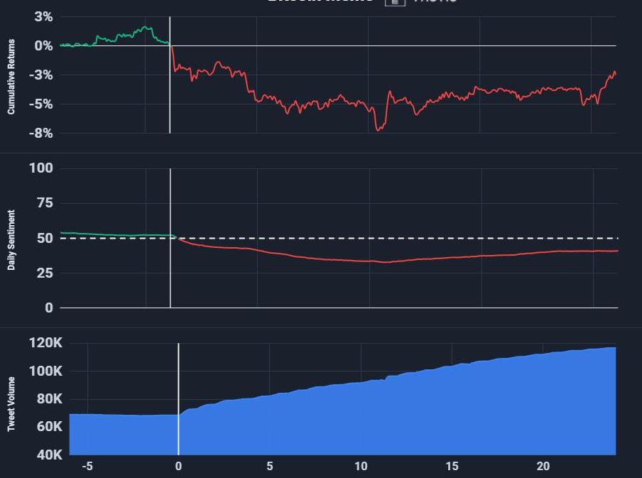 下面的所有三重堆叠图表评估了从推文发布前6小时到发布后24小时的价格表现、情绪得分变化和推文数量变化。