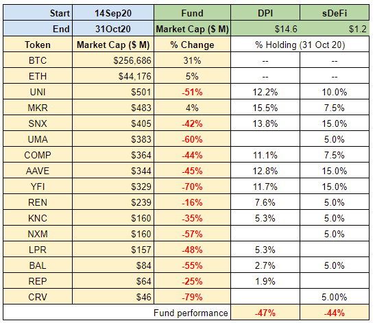 图3:2020年9月14日至10月31日,$ETH、$BTC、$DPI和$sDeFI的表现。