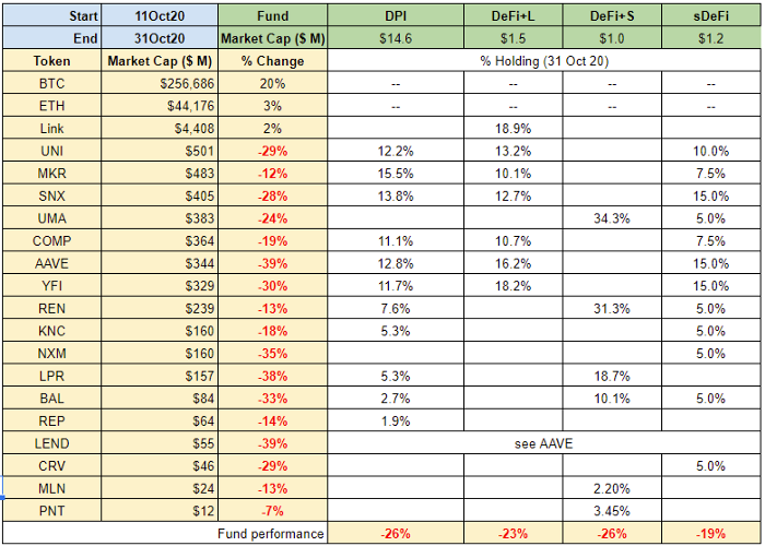 表2:2020年10月11日至31日的$DPI、sDeFI、$DeFi+L和DeFi+S及成分Token的表现