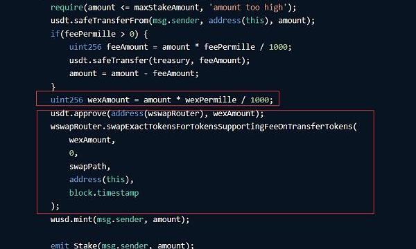在攻击过程分析中我们可以看到,黑客质押USDT获取WUSD时,WUSDMaster合约自动将一部分USDT兑换为WEX