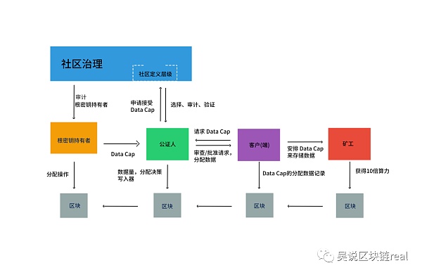 有效数据提供端,认证客户发送存储“真实数据”的请求,公证人收到存储请求之后,验证数据,提供分配DataCap,认证客户端在安排Data Cap来存储数据,矿工存储“经过验证”的交易存储数据,完成订单以后,矿工将获得文件原值算力乘以10倍的有效算力。