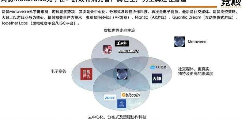 腾讯、网易、字节跳动等互联网大厂已悉数入局Metaverse元宇宙赛道。网易Metaverse元宇宙布局,游戏是优势项,其次是去中心化、分布式及远程协作科技,再次是电子商务,最后是社交媒体。