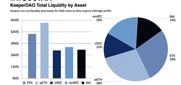 重要的是,这些MEV利润的一部分将被发送至KeeperDAO的「Treasury」(协议金库)中。这意味着,随着参与进来的keepers的盈利能力的提升,Treasury也将增长。截止6月27日,KeeperDAO的?Treasury中共计有600亿美元,这些资金的组成方式如下图所示: