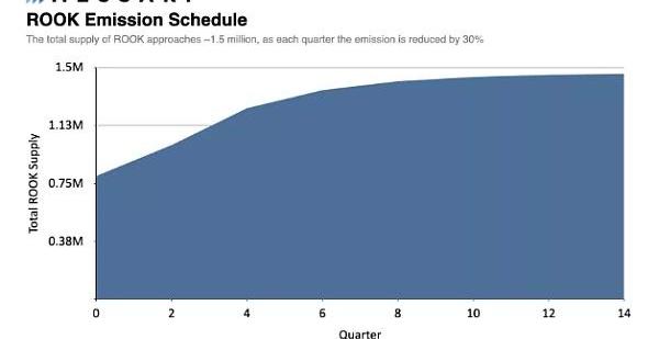 ?上图:ROOK代币的季度发行计划:根据70%的衰减系数,每个季度的ROOK发行量将比上一季度减少30%,最终ROOK的总供应量将接近150万左右。
