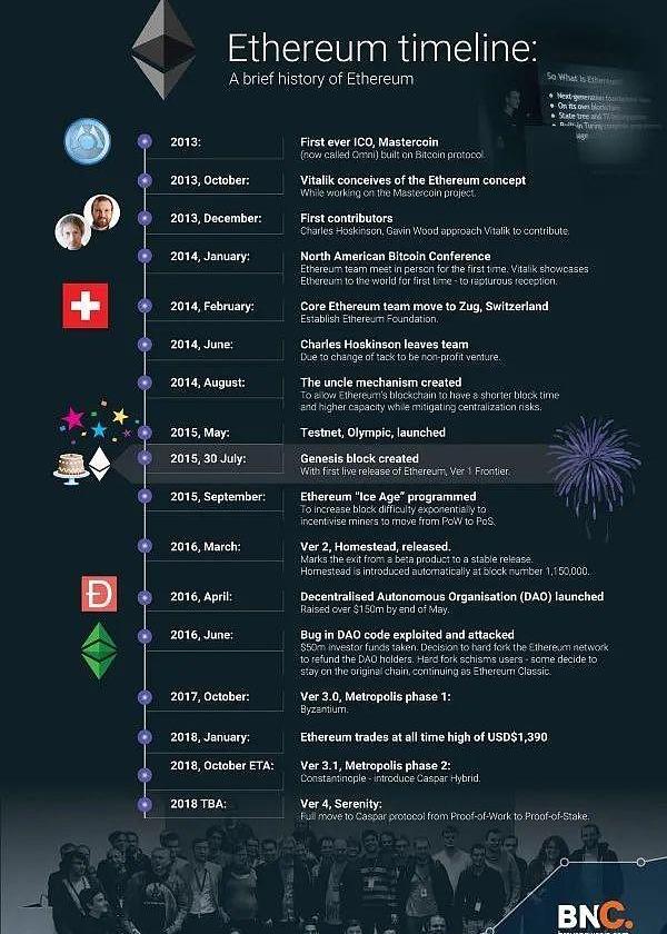 以太坊发展的时间线,引用自BraveNewCoin。倒数第二个里程碑已经过时——推迟到了2019年1月?
