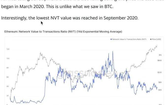 下跌趋势看涨。这意味着网络上发生的交易的增长速度超过了市值的增长速度。一个简单的图表或以太坊可以告诉我们随着时间的推移,我们需要知道的一切。可以看到在2021年1月,我们可以看到灰色价格上升,但NVT下降,这是非常乐观的。