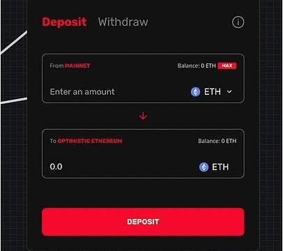 1.?首先,登录Optimism?Gateway页面,选择ETH或其他代币数量?(目前只支持ETH、wBTC、SNX、USDT、DAI和EURT),你如果想进行跨链资产转移,点击“存款”按钮。