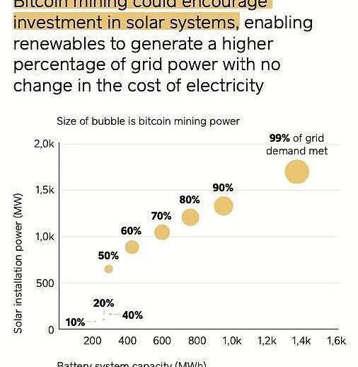 比特币挖矿可以激励对太阳能系统的投资建设,在电网中生产的电能占比提升,而电力成本仍保持不变。