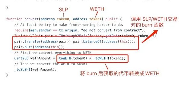 2、调用 Sushi Swap 的 convert 函数,传入的 token0 为第一步获得的 SLP,token1 为 WETH。调用 convert 函数后,Sushi Maker 合约会调用 token0 和 token1 构成的代币池的 burn 函数燃烧 SLP1,燃烧掉攻击者在第一步中打入 Sushi Maker 合约中的 SLP1,得到 WETH 和 SLP。