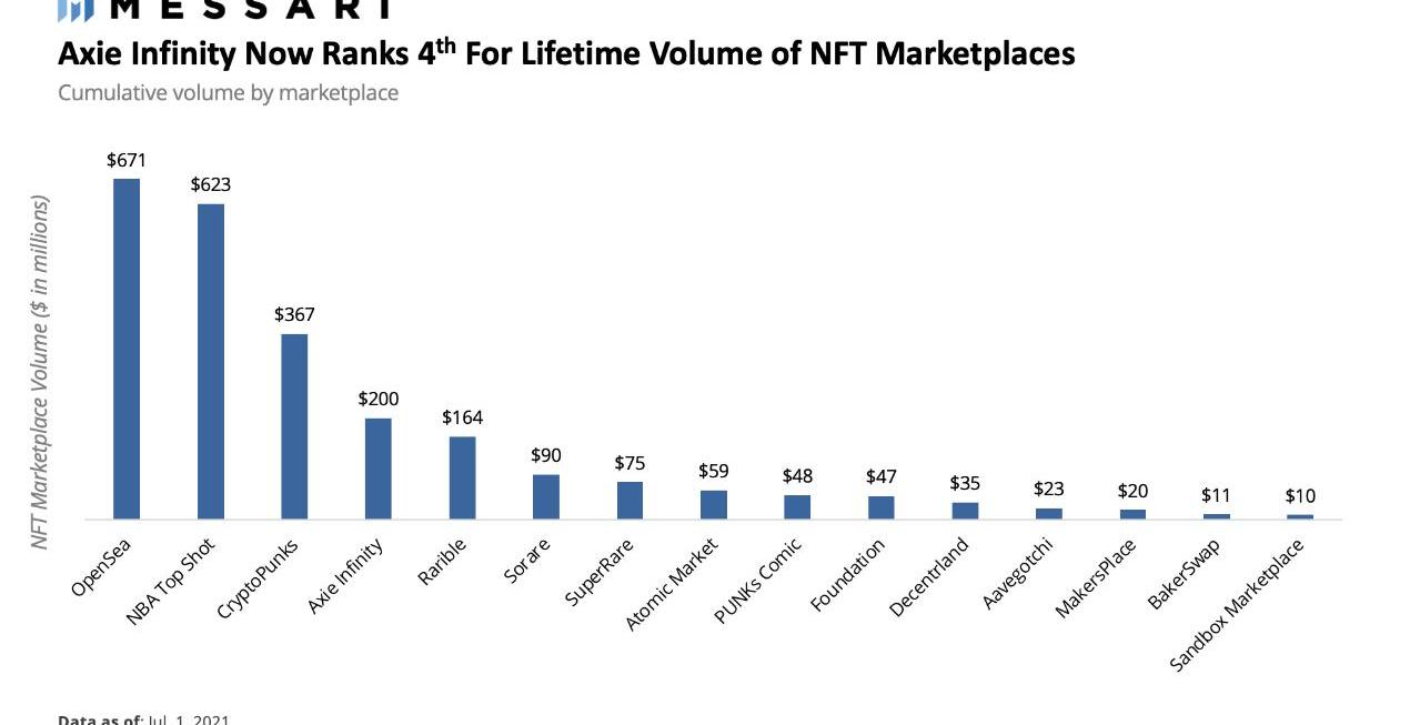 虽然OpenSea仍然是整个市场的领跑者,但AxieInfinity在本季度迅速崛起,成为全球第四大的NFT市场。