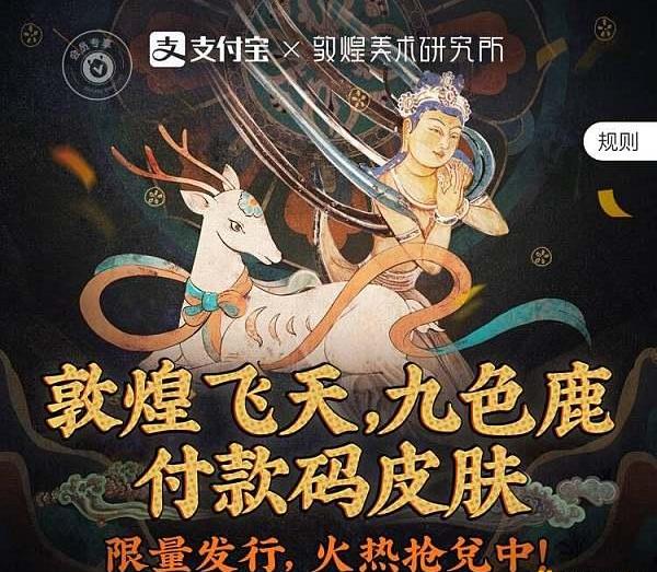 2021年6月21日0:00,支付宝在蚂蚁链粉丝粒小程序上限量发售“敦煌飞天,九色鹿”付款码NFT皮肤。这两款NFT是由支付宝和敦煌美术研究所联合发售。购买后NFT皮肤会显示在付款码上方。