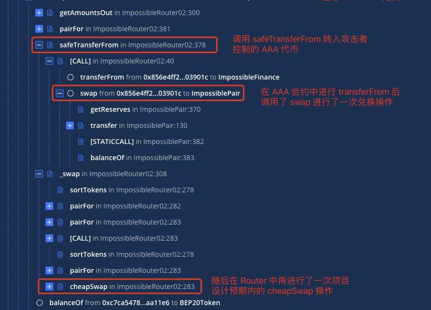 通过分析具体的内部调用流程我们可以发现,攻击者在Router合约调用AAA合约的transferFrom函数将AAA代币转入Pair合约的过程中,同时调用了一次Pair合约的swap函数(即在transferFrom函数实现了正常转账与swap调用的逻辑)。然后再通过项目设计预期的cheapSwap再进行一次正常的代币兑换操作。