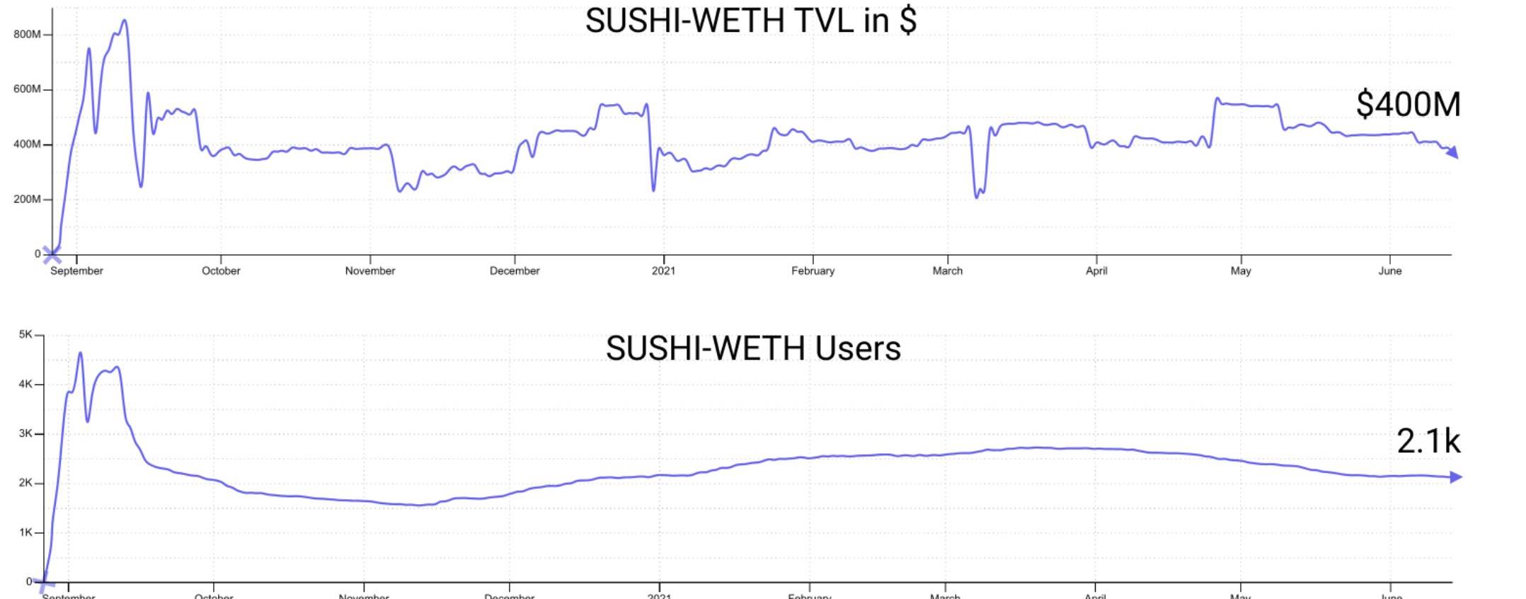 Sushiswap上存在许多收益率不同的资金池。出于本文的目的,将使用Sushiswap中第三大的SUSHI/WETH池。该池在2020年和2021年初备受欢迎,因为与Sushiswap中的其他池相比,它的奖励有所增加。在2021年初,SUSHI的奖励达到100%,到今年6月的年利率约为20%。