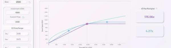 如上图,如果你只有1000美元的资金量,在传统V2中只能是1000美元资金做市,按池子占比获取手续费收益。但在V3中,你可以用风险换取杠杆,例如选择蓝色策略,即将1000美元聚集在当前汇率点前后50%波动范围内,你将获取4倍的资金效率,相当于在这个区间范围内拥有了4000美元做市;选择紫色策略,将1000美元聚集在当前汇率点前后1%波动范围内,你可以获取175倍的杠杆,相当于17.5万美元做市。这是非常恐怖的,似乎可以说这跟在中心化交易所里梭哈自己的一部分资金百倍做多或做空的性质一样,而官方也给出了一个4000倍资本效率的最高值。