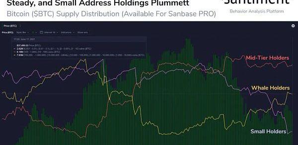 链上分析平台Santiment数据显示,虽然比特币重新跌落至6月12日的水平。持有至少1,000枚BTC的“巨鲸”继续显示出囤积模式,中型“鲸鱼”也没有退缩,而持有较少数量的比特币地址正在快速下降,说明散户在恐慌抛售。