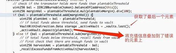 但是问题就出在了_plantOrRecallExcessFunds函数中。由于在记录充值信息的时候,用的是_vaults.last()来获取最新的vault,所以其实充值信息叠加在了最后一个元素上。但是项目方调用了三次setActiveVault函数,所以其实充值信息是叠加到了_vaults数组的3号元素,也就是index为2的vault元素上。但是在transmuter合约在harvest的时候传入的_vaultId却是0,0号元素是没有任何充值记录的,所以transmuter合约就误将所有的收益都给了adapter了。导致了悲剧的发生。