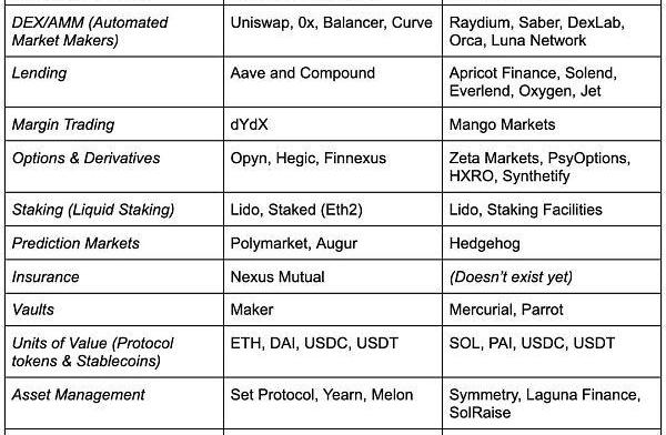 下图是两种不同的DeFi生态系统的市场地图,一种建立在Solana生态系统上,另一种建立在以太坊生态系统上。