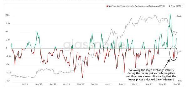 在最近的市场调整期间,交易所看到大量的比特币短期持有者的大量净流入。随着价格下跌,交易所之间的净转移量也在下降,甚至在价格下跌接近尾声时再次变为净负值。这表明较低的价格引发了新的需求,增加了买家在逢低期间将继续参与的信心。