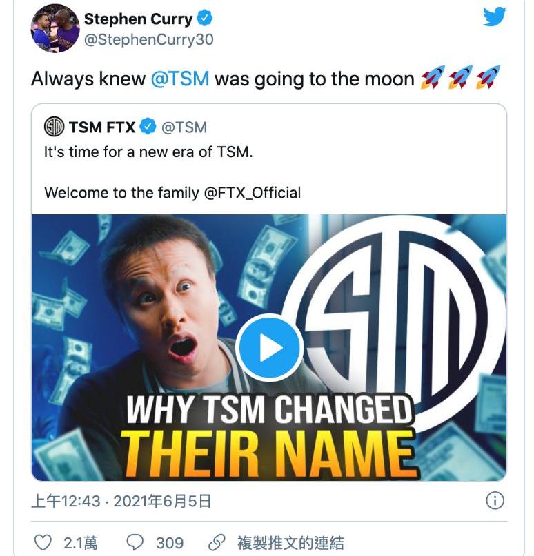 NBA金州勇士队的明星控卫库里于6月5日在推特转发了全球知名电竞团队TSM和FTX的合作影片,并写道早就相当看好TSM。