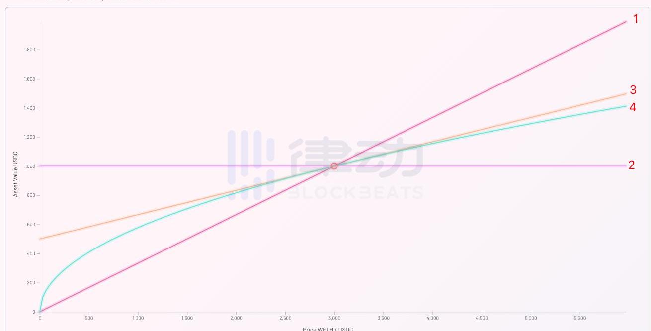 这其中非常值得注意的是,如果投资者选择策略4,也即用1000美元购买名叫「LPPosition」的基金参与做市,则该基金的期末市值除价格的起始点以外,始终都会低于策略3。而这部分差异,也就是我们常说的「无常损失」。无常损失所反映的,便是这只名为「LPPosition」的基金,在价格变化时的主动调仓管理,预期会给投资者带来的额外亏损。