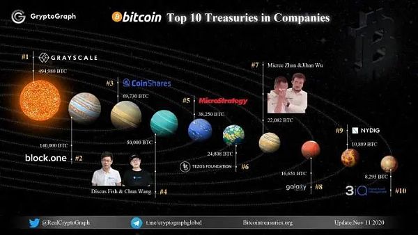 下面这张制作于两周前的图,大概标记出了灰度的比特币持仓规模在与其他机构的差距,与 EOS 的母公司 Block.one 曾表示,在 2018 年底配置了 14 万个比特币。这个数字当时惊为天人,但现在的灰度是 Block.one?的近四倍。