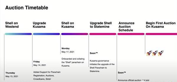 接下来马上会发生的事,包括将Shell链升级为Statemine,也就是Kusama的资产链,它跟Statemint差不多,不过是在Kusama上的。