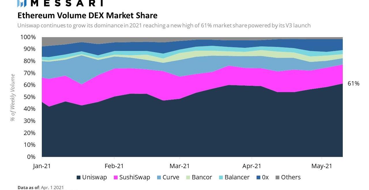 目前,UniswapV3的成功加上UniswapV2持续的主导地位,已经使Uniswap的市场份额增加到2021年的新高,达到61%。在整个2021年,Uniswap的市场份额持续增加。