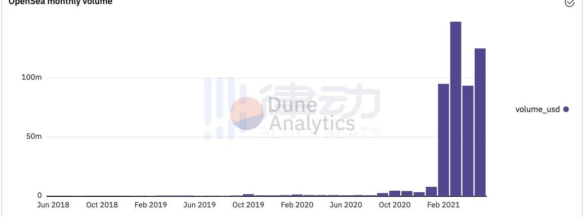 随着NFT走入主流,越来越多的艺术家、项目方都开始加入到NFT领域之中。自2021年开年以来,最大的NFT交易平台OpenSea的月度交易量呈爆发式增长,其中,Meebits、BoredApeYachtClub、Ghxsts等新项目的火爆是推动交易量大幅增长的主要原因之一。