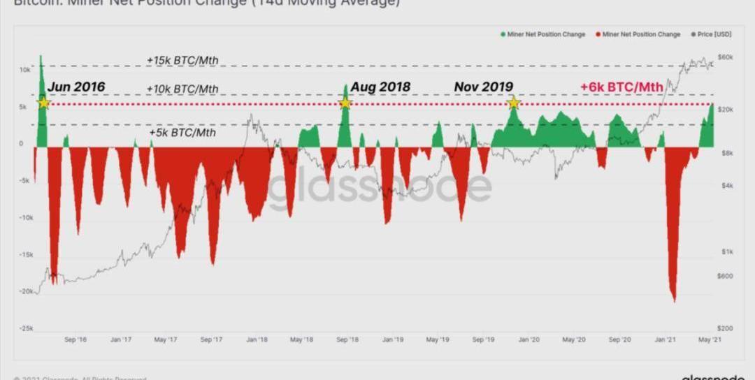 整个4月和5月,?大部分矿工已经转向了屯币,矿工余额的净变化呈绿色。该指标是通过查看过去30天的时间里矿工余额的净变化来计算的。该指标目前显示,矿工不仅净积累资金,而且还在以越来越高的速度积累资金,?这表明他们有坚定的信念和乐观情绪。