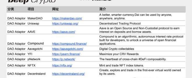 总结来看,本质上,任何具有DAO治理和管理的自治组织都可以称为DAO,所以DAO更像是一个「可组合模块」渗透到各类项目当中去,这类生态组成在此定义为「DAOAdaptor」,其中大家熟悉的项目包括Uniswap,MakerDAO,AAVE,Compound,YFI,Aavegotchi,Decentraland等都是DAO组织的先行者。