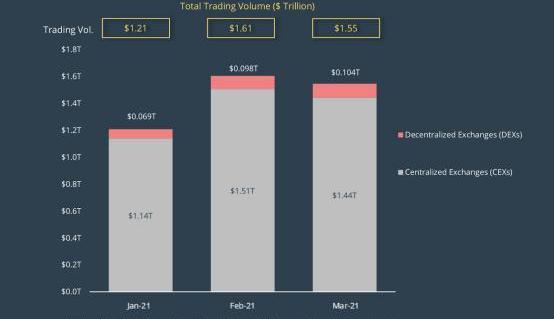 由于区块链基础设施的限制,DEX在很多方面还不是中心化交易所的对手。根据数据得知,去中心化交易所交易量大约占总交易量的1-4%。截至2021年3月,前10名DEX的总交易量明显不如前10名CEX的交易量,比例分别为0.104万亿美元和1.44万亿美元。