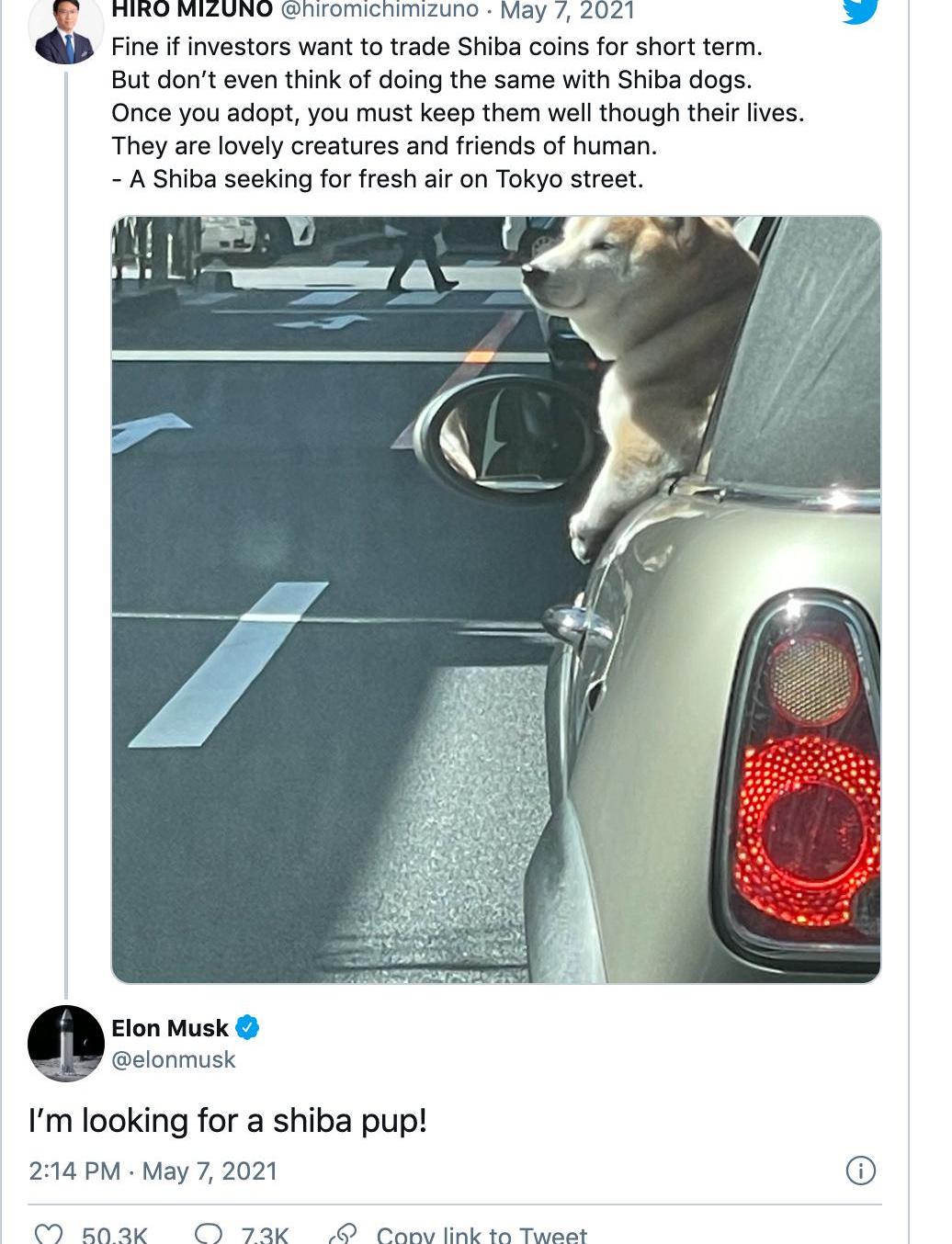 什么原因导致SHIB上涨?特斯拉CEO、自称为「狗狗币」之父的马斯克在推特谈及「柴犬」。5月7日,刚上任不久的联合国创新金融和可持续投资特使水野弘道在推特发文称,请Shibacoins的投资者不要像对待手里的币那样对待自己的宠物狗。马斯克随后回应称,“我想要一只小柴犬。”