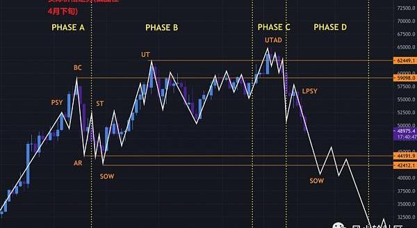 这位博主的账号名是uncomplication,他在4月底的一篇视频已经有16万播放量,海外币圈很多知名大V的vlog都很难达到这个数量,目测还在进一步被转发扩散,他在20多天前说了个什么事情呢,主要就是认为大饼这几个月的走势非常符合威科夫鼓票理论中的一个筹码派发形态,上图: