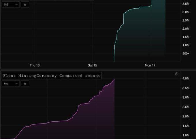 创世参与者在发布之前已经把稳定币或ETH预兑换成了FLOAT,大约有400万枚FLOAT被预兑换。到现在为止,绝大多数预兑换的FLOAT已经被铸造提取了出来。