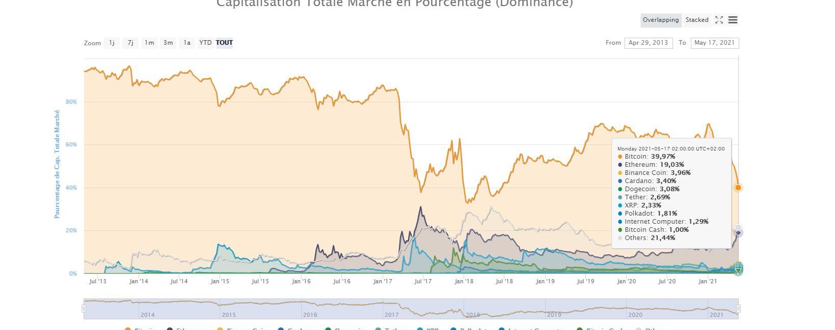 鉴于近期马斯克对于比特币毫不留情的推特攻势,其中也包括一部分比特币空头参杂其中,比特币未能顶住压力,开始向4.5万美元下方滑落,同时比特币也在逐渐失去市场份额,其市场霸主地位正在下降,据tradeview数据显示,比特币目前市值占比已经下跌40%附近。
