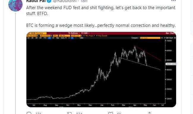 推特分析师RaoulPal认为这波经历了恐慌和骂战的大跌仍是一次健康的回调。