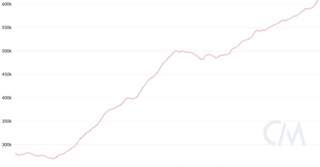 第三,以太坊的活跃钱包也有一个相应的激增,其每日活跃地址数上升到625K(90天MA),远远超过它的历史最高点。