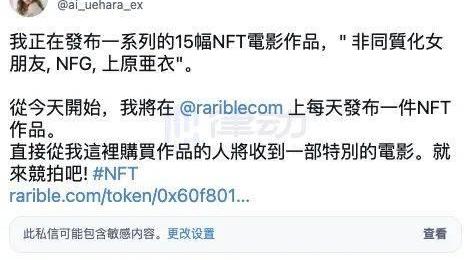 日本著名女优上原亚衣发推表示将在NFT交易平台Rarible拍卖15件《非同质化女朋友》系列NFT收藏品,最终的买家还将获得一部特别电影。