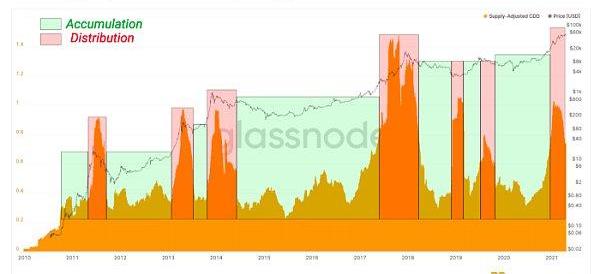 当比特币信仰者积累比特币时,老比特币很少被花费,而被破坏的比特币币天数往往很低。在牛市后期,越来越多的老比特币被卖出获利,导致CDD激增。应用长期移动平均线可以帮助消除噪声并识别这些宏观变化,甚至可以估计市场的顶部和底部。