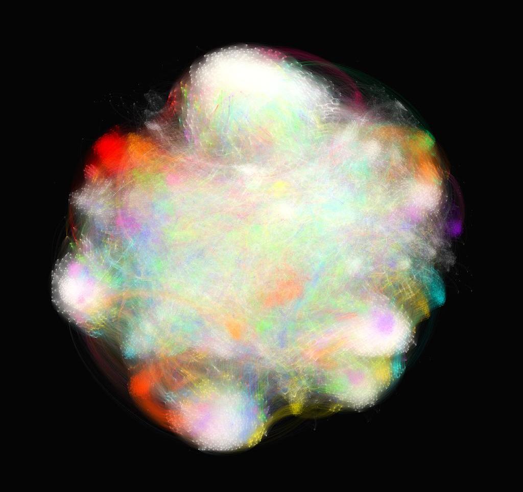 正如你所看到的,这个网络有几个大型的、容易被发现的"社区"——相互之间紧密联系的艺术品集群。这些社区代表什么?起初,我们怀疑它们是基于NFT的各种子类型的艺术作品的集合,表现出视觉或概念上的相似性,从而吸引了具有相似品味的收藏家。为了验证这一猜测,我们给每个节点分配了一种颜色,对应于创作该作品的艺术家。但是,由此产生的色彩混乱并没有证实这一假设。虽然在这些社区中,似乎存在着对某些艺术家的轻微偏好,但这种模式似乎是偶然的,而不是解释性的。