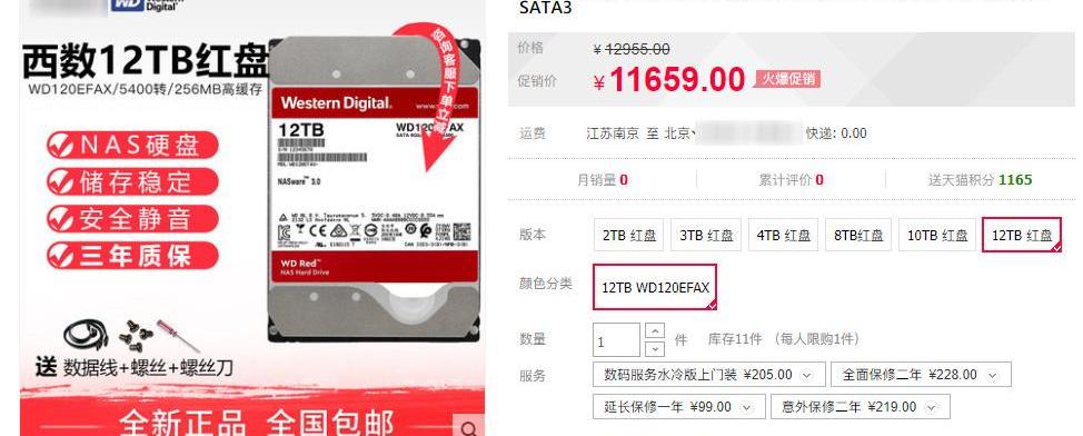 西部数据红盘12TB目前在京东上价格为3499元,但是无货。而在淘宝上,现货价格已经涨至11659元。