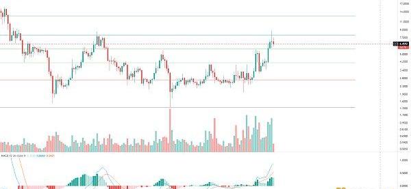 日线调整周期,短期内走强概率不大,需要时间的整理酝酿,不过大方向仍是多头趋势,回落反而是趋势低吸的机会,支撑5.7和5美金。